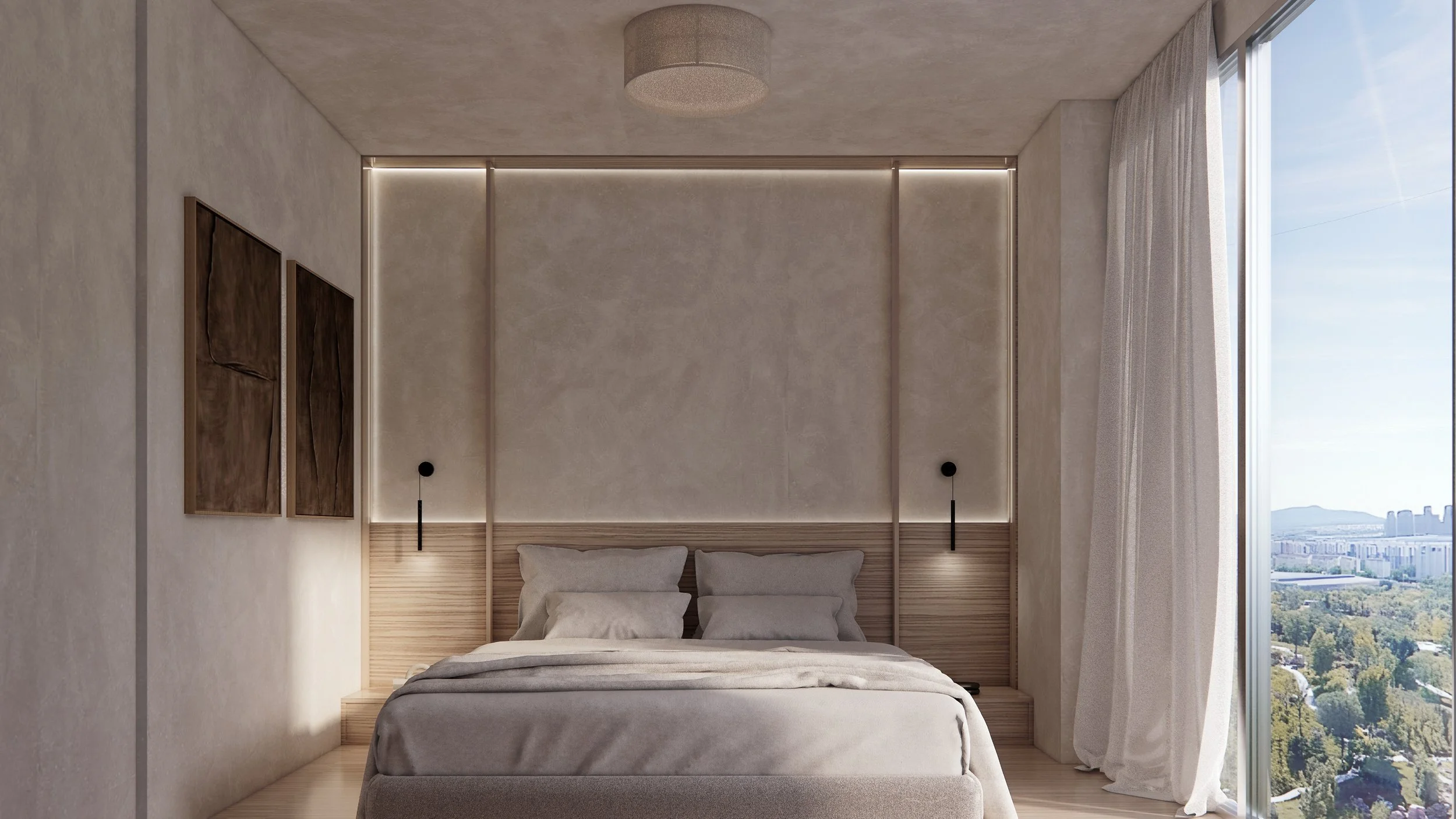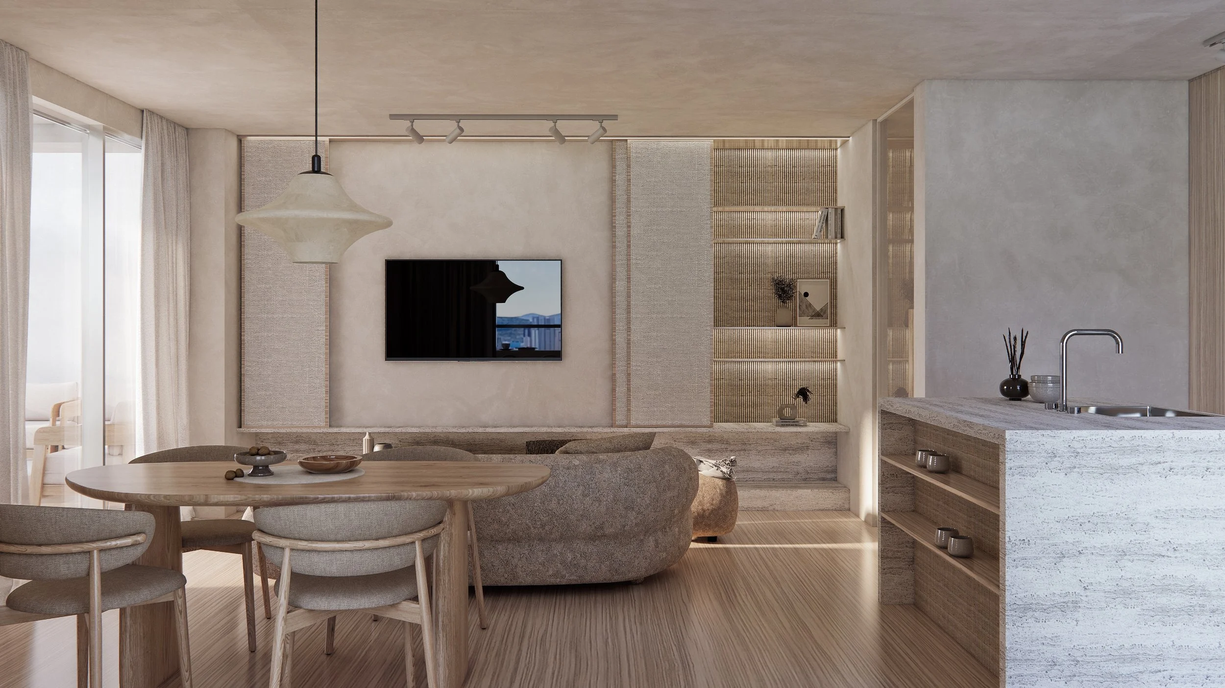The design focuses on simplicity and calm, with muted colors, natural stones, and thoughtful detailing that create a comfortable and balanced environment.